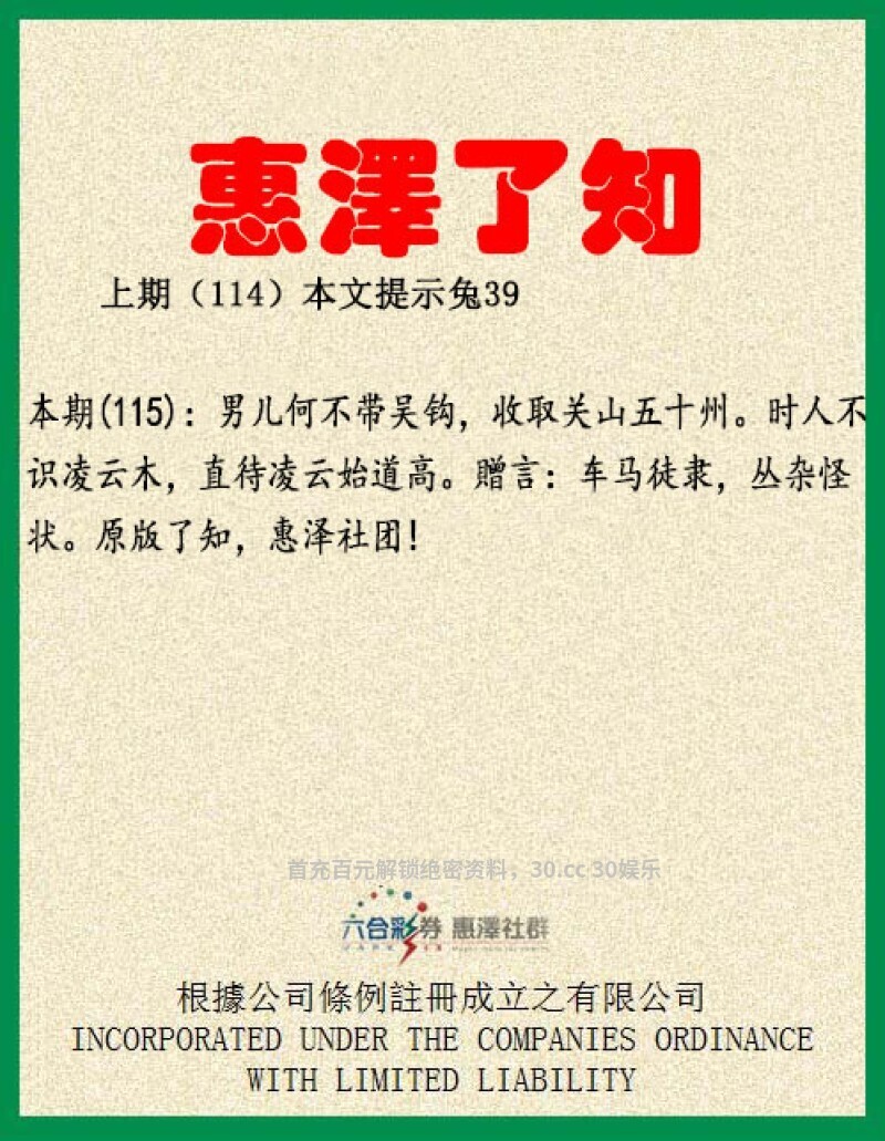 【惠泽了知】115期:男儿何不带吴钩,收取关山五十州。此句诗词意思是:男子汉大丈夫为什么不腰带武器,去收复黄河南北被割据的关塞河山五十州呢?解战肖虎狗马牛。南肖北肖:蛇牛鸡羊兔猪。时人不识凌云木,直待凌云始道高。此句意思是:世上的人不认识这是将来可以高入云霄的树木,一直要等到它已经高入云霄了,才承认它的伟岸。解木肖:虎兔。贈言:车马徒隶,丛杂怪状。