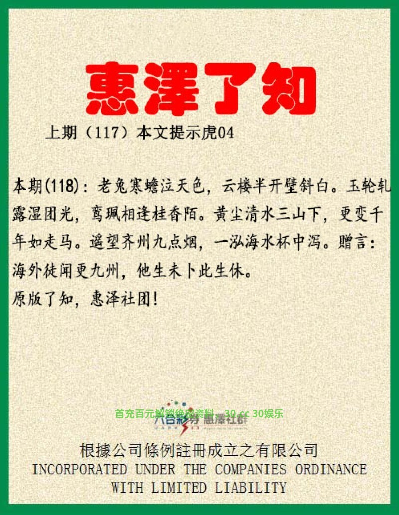 【惠泽了知】114期:良才女貌世间稀,龙头蛇尾难成才,解明肖龙蛇。才子肖虎龙猪马。行人心事意徘徊,前缘配定不须疑。前缘解前肖鼠牛虎兔龙蛇。赠言:三十一过迎金钱,财有财路任人挑,人生何日能及此,一改旧貌换新颜。